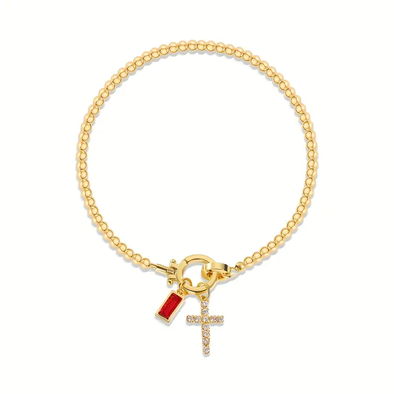 Carry the power of divine protection with you â wherever life takes you. The Paperclip Birthstone Cross Charm Bracelet is a joyful expression of faith and style. Whether layered or worn as a standalone statement, it adds a pop of color and sophistication to any outfitâperfect for brightening both your look and your day.